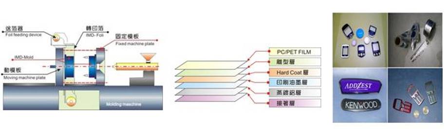 將印刷完成的薄膜利用不同型式置入模具,經射出成型后,得到具有印刷質感之成型,結合產品設計、模具技術部與傳統后加工技術為一體的制程技術。主要應用材料包含片材、樹脂、油墨三部分。
